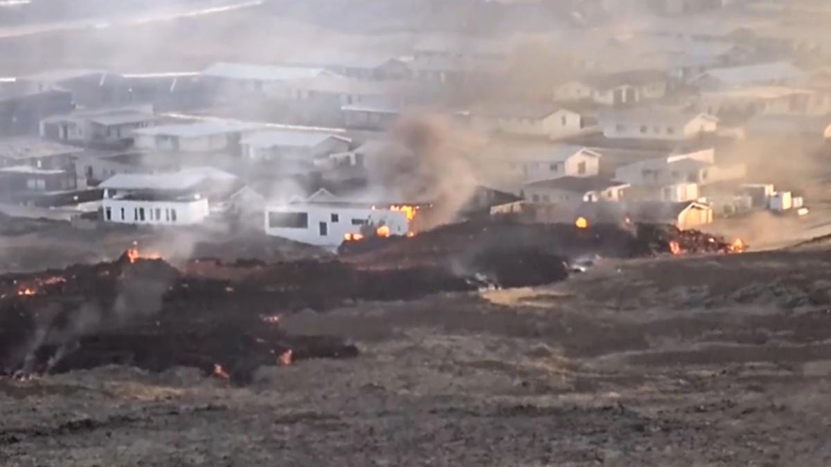 Volkan kaynağından akan lavlar yerleşim yerlerine ulaştı. Lavların yuttuğu bazı binalar, lav çamuru arasında alevlere teslim oldu.