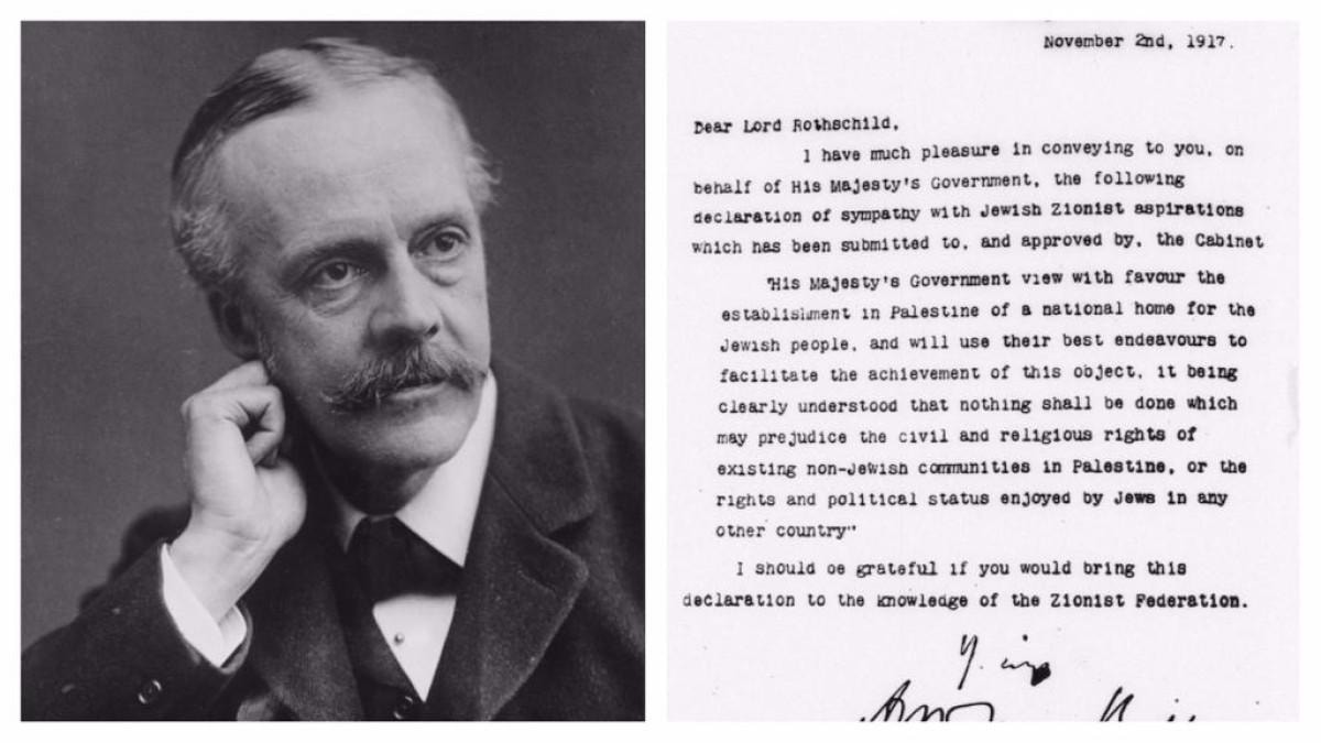 Eski İngiltere Dışişleri Bakanı Arthur James Balfour, Siyonist hareketin önde gelen figürlerinden Rothschild Ailesi'nin baronu Lord Walter Rothschild'e 2 Kasım 1917'de mektup gönderdi.