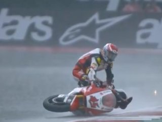 Islak zeminde aracının kontrolünü kaybeden Japon pilot hakimiyetini kaybettiği motoruyla önce yan yattı, ardından metrelerce sürüklendi. Ayağını son anda motorun altından kurtaran Nagashima, yan yatan motorunun üzerine çıkarak adeta bir sörfçü gibi pistin üzerinde sürüklendi.