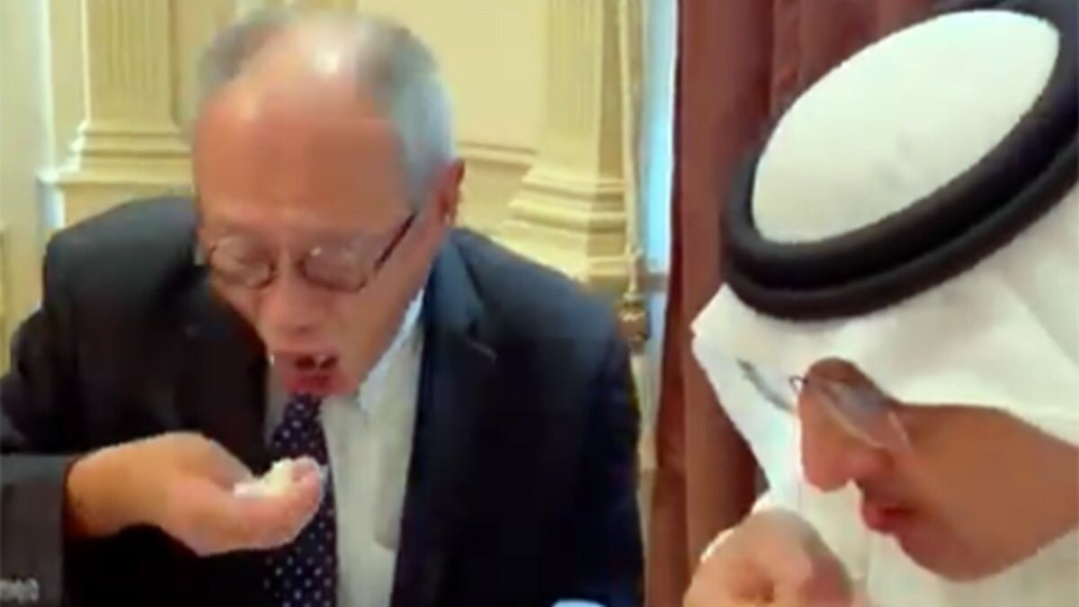 Suudi Arabistan'da eliyle yemek yemeye çalışan Japon büyükelçinin görüntüleri, sosyal medyanın gündemine oturdu.