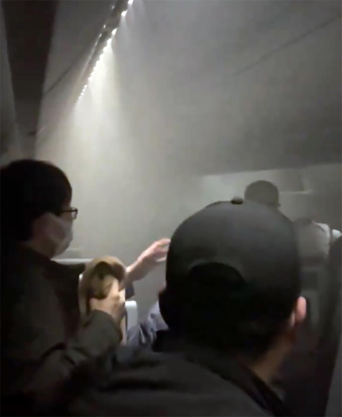 Başka bir anda ise kabinin dumanla kaplandığı görüldü. Yolcular, dumandan etkilenmemek için maskelerini taktı.