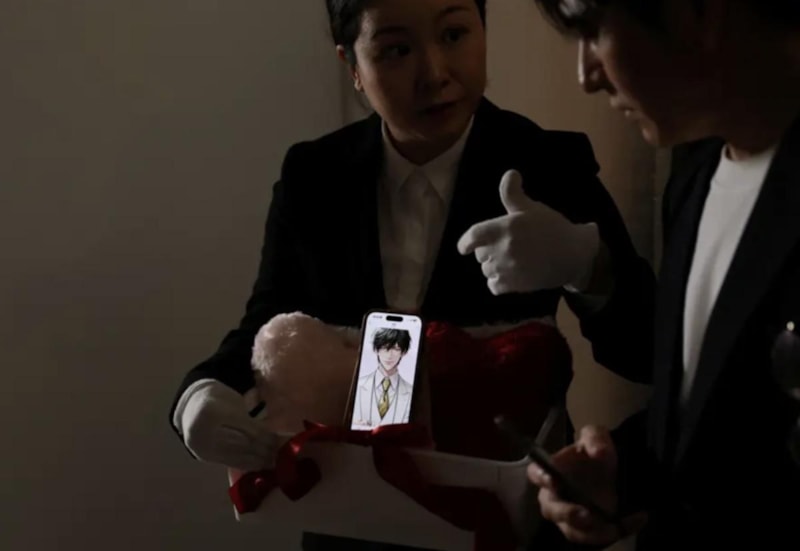 Noguchi, küçük bir sehpaya yerleştirilmiş akıllı telefonun üzerindeki yapay zeka damat Klaus'un karşına geçerek yüzük takma seremonisini gerçekleştirdi.