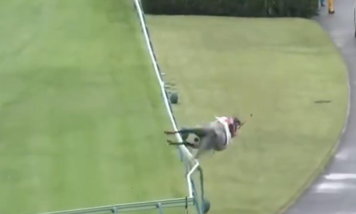 Yarışmayı reddeden at, atladığı sırada çitlere takılarak yere sertçe düştü ve yuvarlandı.