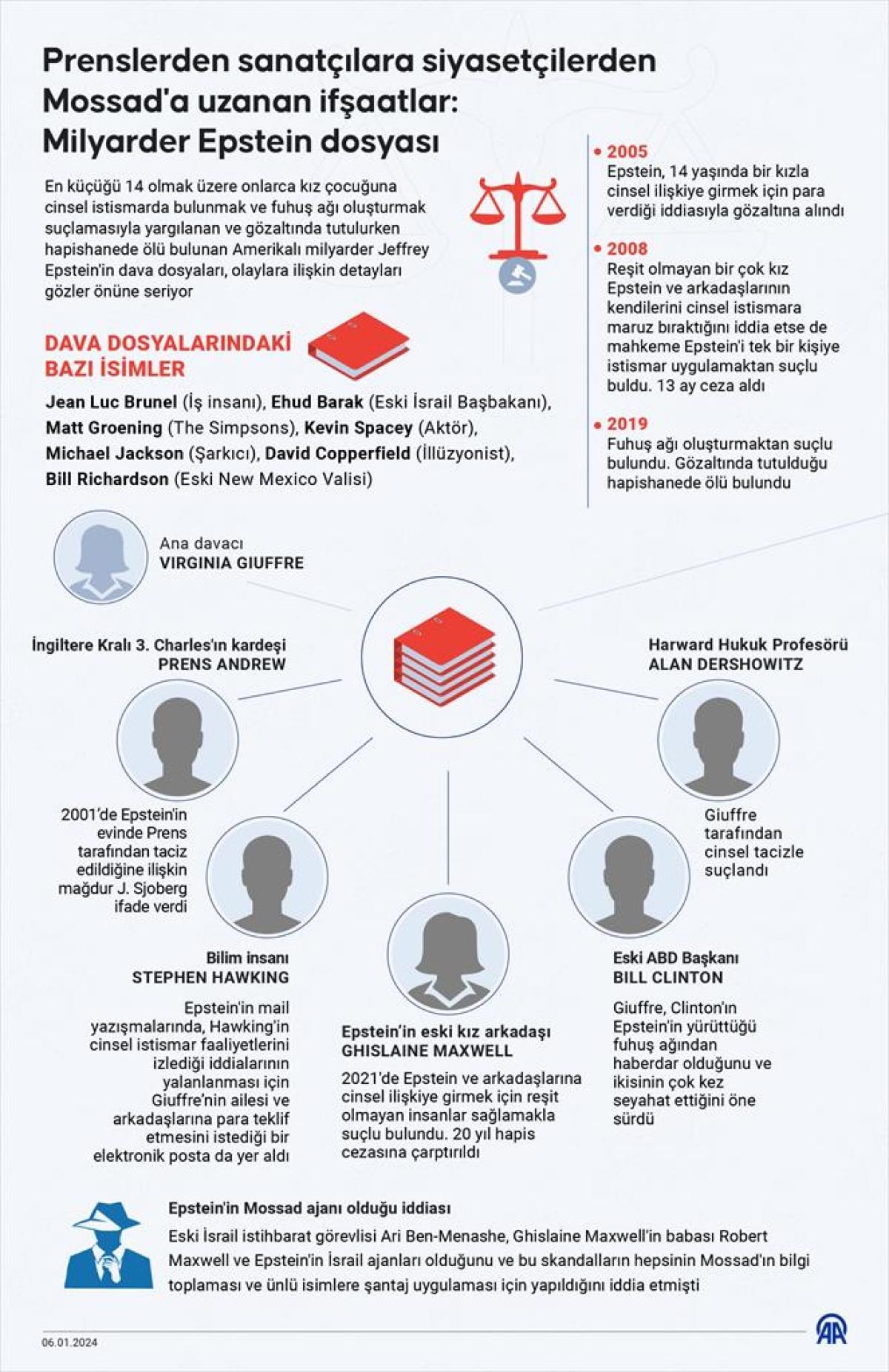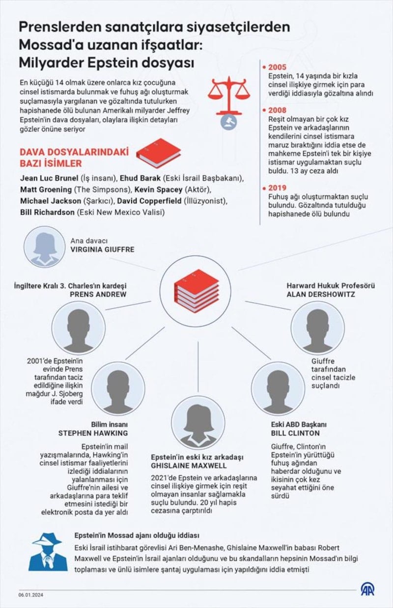 Giuffre’nin cinsel ilişki için zorlandığını iddia ettiği diğer isimler arasında Harvard hukuk profesörü Alan Dershowitz, Victoria's Secret'ın sahibi Les Wexner, yatırım fonu sahibi Glenn Dubin ve ABD'nin eski Orta Doğu özel temsilcisi George Mitchell de yer alıyor. Söz konusu isimler, daha önce haklarındaki iddiaları reddetmişti.