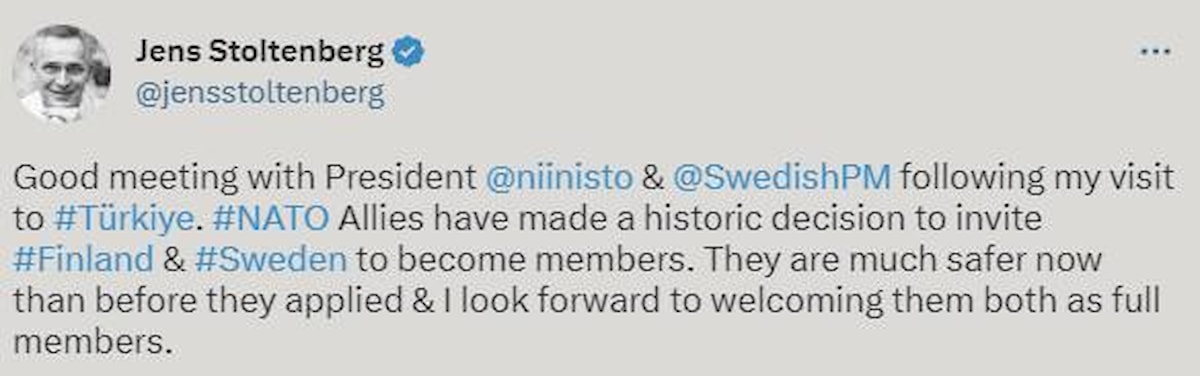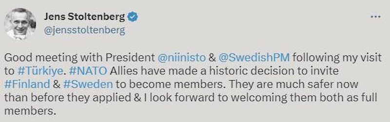 Türkiye'ye ziyaretimden sonra Cumhurbaşkanı Niinistö ve Başbakan Kristersson ile güzel bir görüşme gerçekleştirdik. NATO müttefikleri, Finlandiya ve İsveç'i üyeliğe davet etmek için tarihi bir karar aldı. Şimdi başvurmadan öncesine kıyasla çok daha güvendeler. İki ülkeyi de tam üye olarak karşılamayı dört gözle bekliyorum.