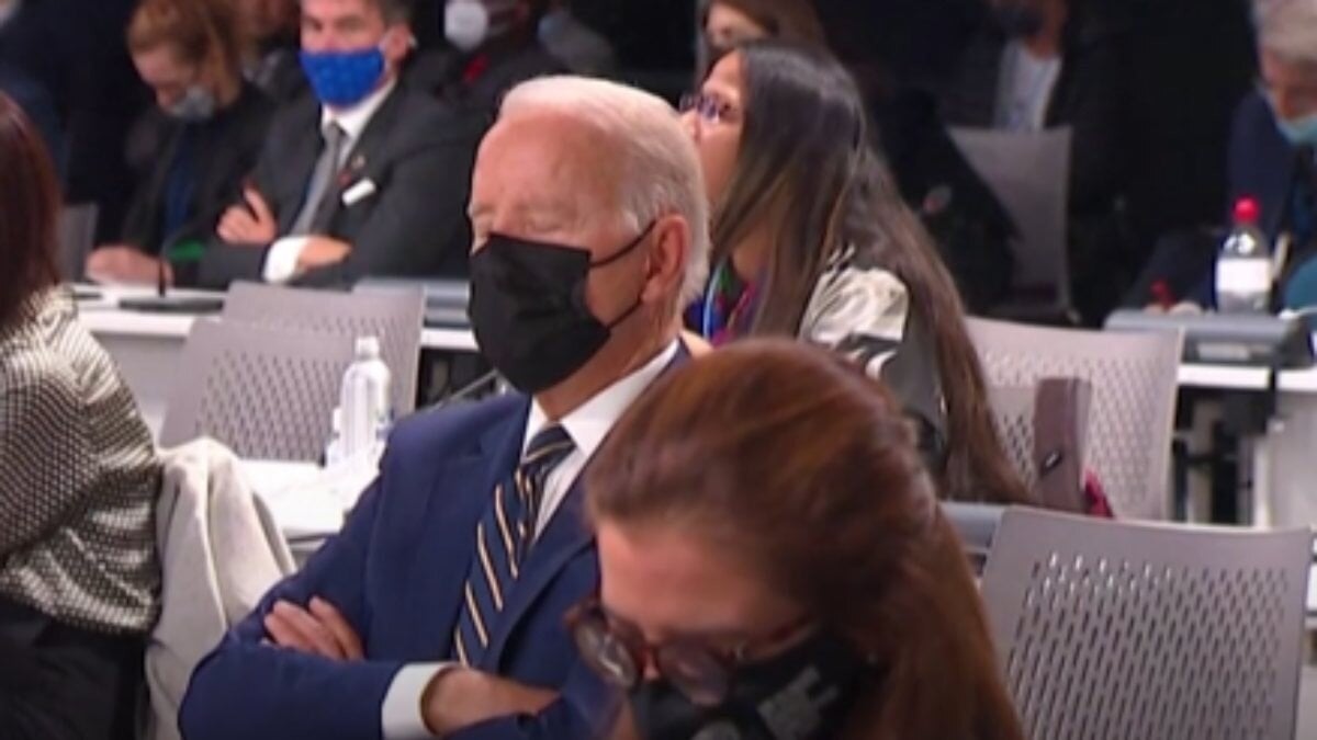 Konferansta bir engelli hakları aktivistinin mesajı okunduğu sırada Biden'ın gözlerinin kapandığı görüldü.