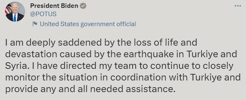 Türkiye ve Suriye'de meydana gelen depremin yol açtığı can kaybı ve tahribattan derin üzüntü duyuyorum. Ekibime, Türkiye ile koordineli olarak durumu yakından izlemeye devam etme ve gerekli her türlü yardımı sağlama talimatını verdim.