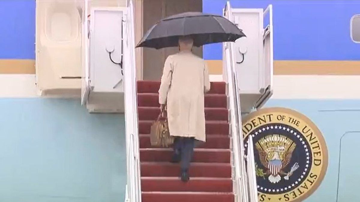 Biden'ın, bir elinde çantası, diğer elinde şemsiyesiyle merdivenleri bu kez dikkatli çıkmaya çalıştığı görüldü.