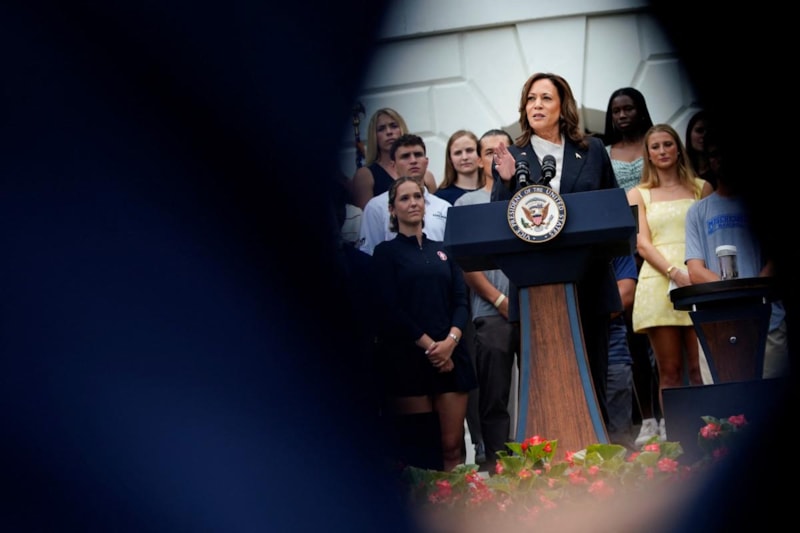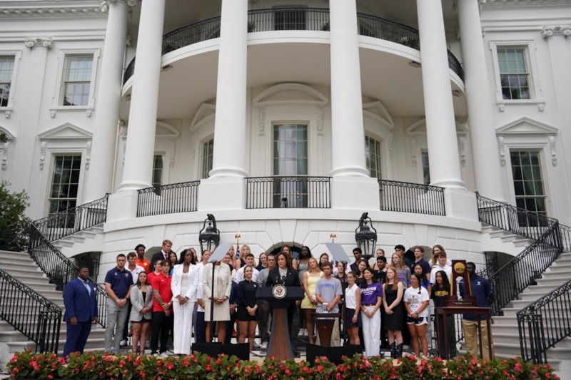 Biden'ın ABD'de kasım ayında yapılacak olan başkanlık seçimlerinde adaylıktan çekilmesinin ardından desteğini açıkladığı Başkan Yardımcısı Kamala Harris, Beyaz Saray'da Ulusal Kolej Spor Birliği (NCAA) şampiyonu olan takımlarla bir araya geldi.