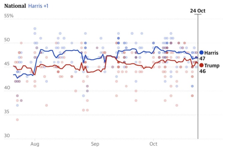 The Guardian gazetesinin ulusal bazda takipçileri arasında yaptığı ankette Kamala Harris'in 10 günlük periyotta, 1 puan farkla Donald Trump'ın önüne geçtiği bildirildi.