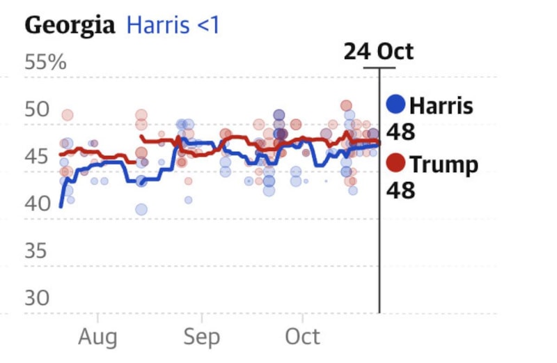 Adaylar arasındaki oy farkını 10 günlük bir periyotta incelemek isteyen The Guardian gazetesi, ulusal ve eyalet bazında yeni bir anket gerçekleştirdi.