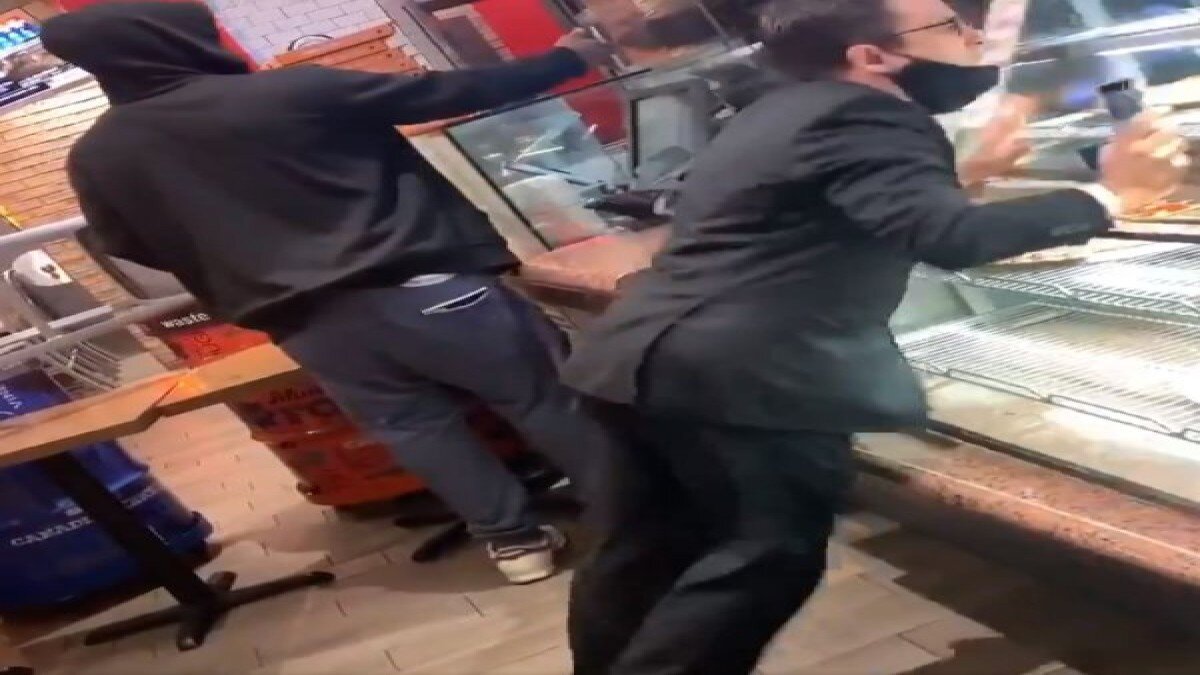 Toronto'da bir pizza restoranında kayda geçen görüntülerde, bir müşteri maske takmayan diğer müşteriye sinirlendi.