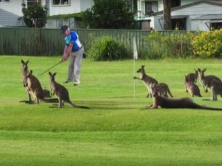 Avustralya'da golf oynamak için sahaya giden sporcular ilginç bir görüntüyle karşılaştı. Bir anda golf sahasını basan kangurular oyunu bloke ettiler. Sporcular kangurulara rağmen golf oynamaya çalışırken kangurular da izledi.
