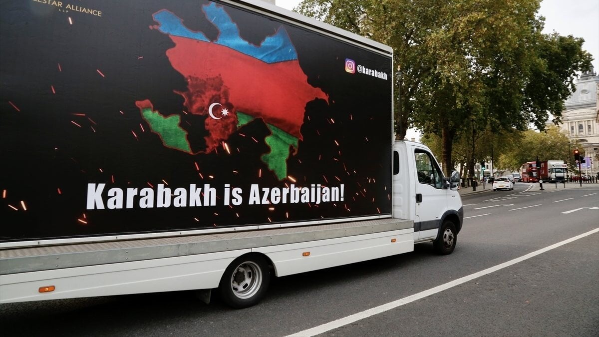 İngiltere’de yaşayan Azerbaycan Türkleri, başkent Londra’da üzerinde "Karabağ Azerbaycan’dır" yazılı bir araç dolaştırdı.