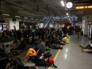 Tren raylarına yatan göstericiler ulaşımı durdurarak bağımsızlık gösterileri gerçekleştirdiler.