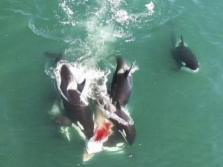Aç kalan grup, bir anda sürünün en yaşlı üyesinin peşine düşüp üstüne saldırdı. Isırık darbeleri ile yüzemeyecek hale gelen dev boyuttaki yetişkin balina da hemcinslerine teslim oldu. Aç kalan hayvanlar kısa süre ierisinde yaşlı balinayı saniyeler içinde bölerek mideye indirdiler.