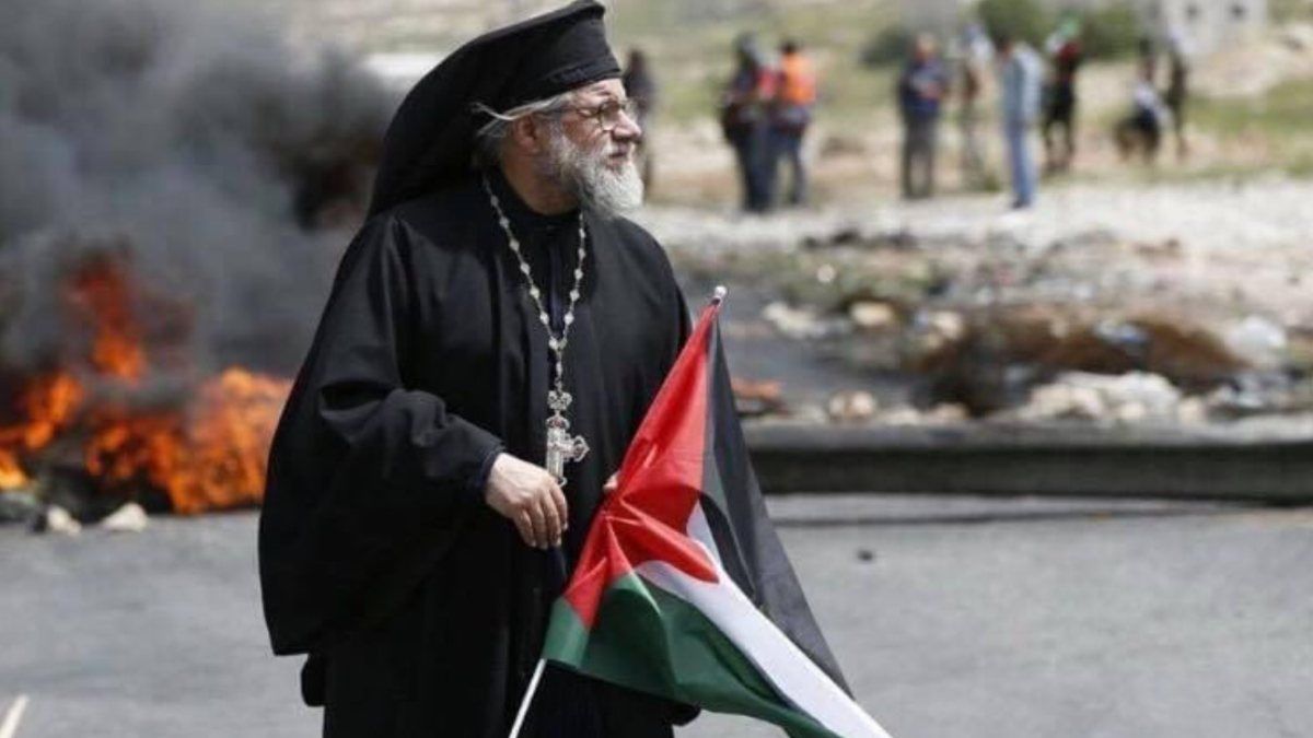 KATOLİK PİSKOPOS, FİLİSTİN BAYRAĞI İLE İSRAİL ASKERLERİNİN KARŞISINDA