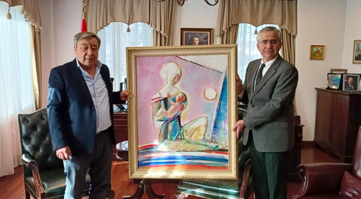 Kazak ressam, satın alan kişilerin ricasıyla tablosunu Türkiye’nin Almatı Başkonsolosu Ali Rıza Akıncı’ya teslim etti.