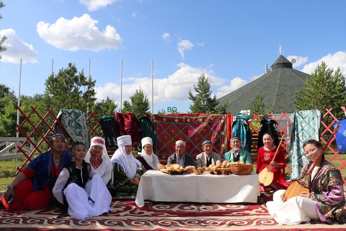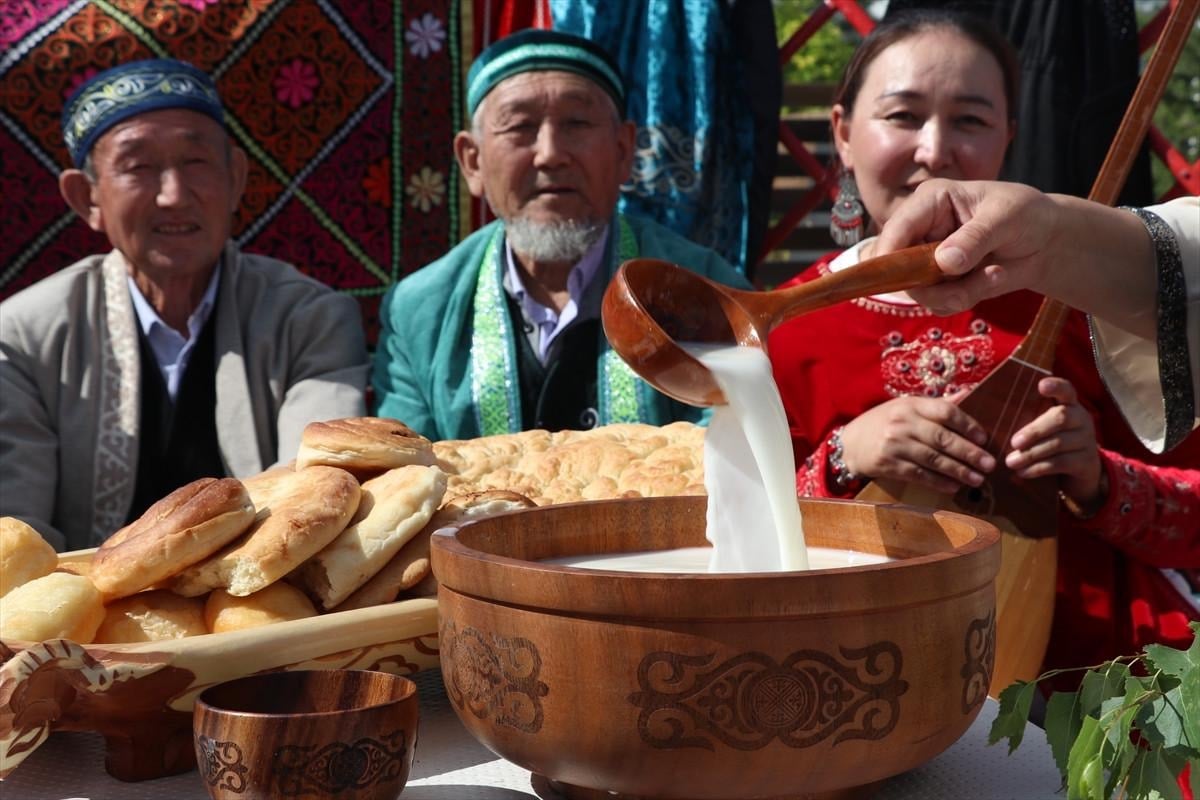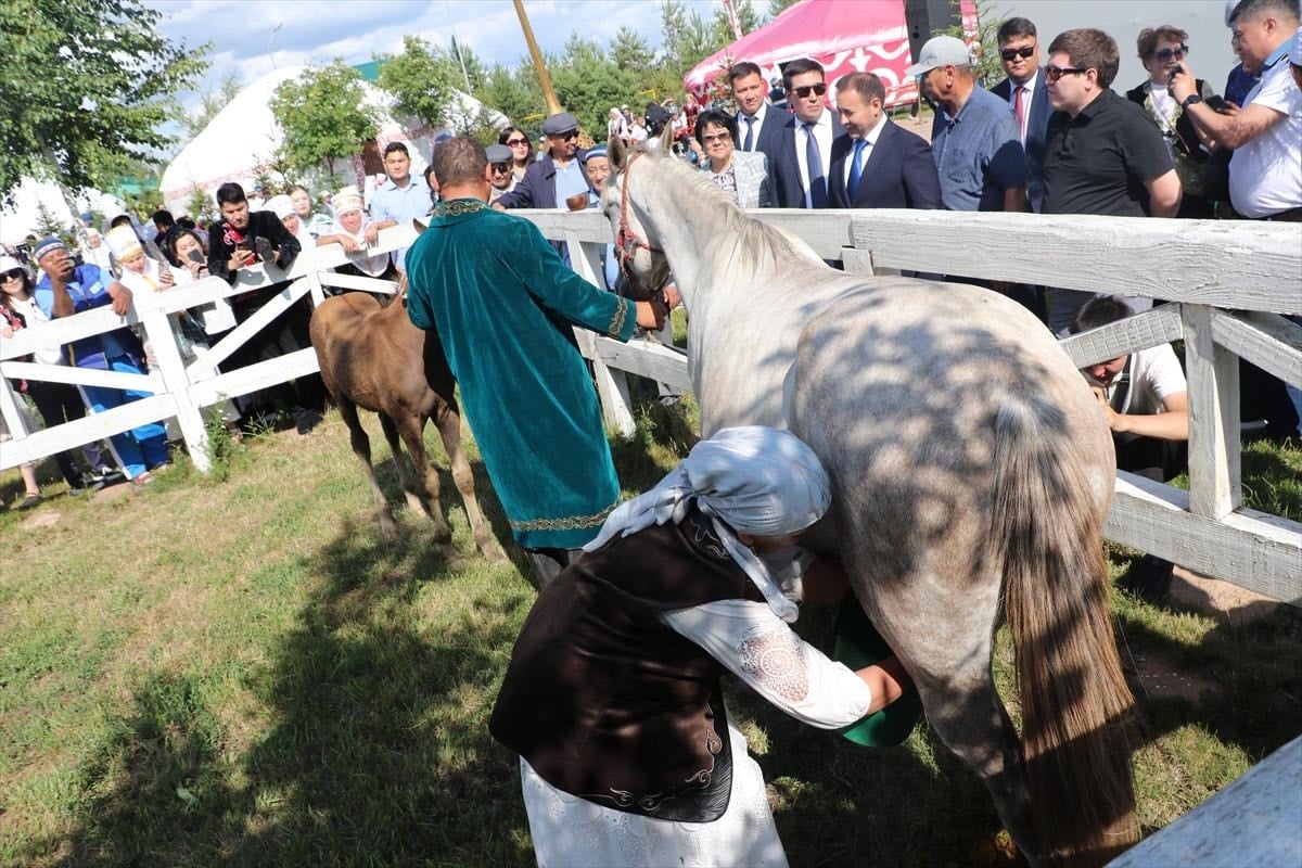 Ziyaretçilere, taze sağılmış at sütü olan "saumal" ikram edilirken geleneksel Kazak mutfağından çeşitli lezzetler de sunuldu.