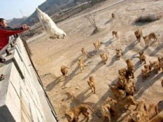 Buraya gelen çocuklar önce keçileri besliyor. Sonra görevlilerin bu hayvanları kaplanlara canlı canlı yem edişini izliyor. Keçiler postlarından tutulduğu gibi 6 metre yükseklikten aslan sürüsünün ortasına atılıyor.