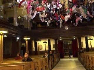 Londra’daki St. James Kilisesi’nin tavanına asılan kıyafetler arasında bebek pijamaları, ayakkabılar, pantolonlar, çoraplar, eldivenler, şapkalar ve daha pek çok giyim eşyası baş aşağı sallanır durumda ziyaretçileri karşılıyor.