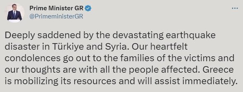 Türkiye ve Suriye'de meydana gelen yıkıcı deprem felaketinden derin üzüntü duyuyoruz. Kurbanların ailelerine içten başsağlığı diliyoruz. Düşüncelerimiz, etkilenen tüm insanlarla birlikte. Yunanistan, imkanlarını seferber ediyor ve acil yardımda bulunacak.