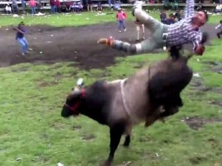 Kızgın boğa rodeo sırasında adamı üstünden atmak istedi. Boğanın üzerinden düşmek üzere olan adam, boğanın tekmesiyle yere yığıldı.