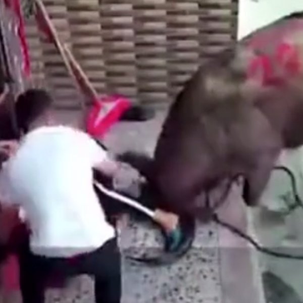 Boğanın geldiğini son anda fark eden anne, kaçmak istese de kurtulamadı. Boğanın saldırması sonucu çığlıklar içinde yere düşen anne ve bebeği fark eden babaysa, boğaya tekme atarak olaya müdahale etmeye çalıştı.