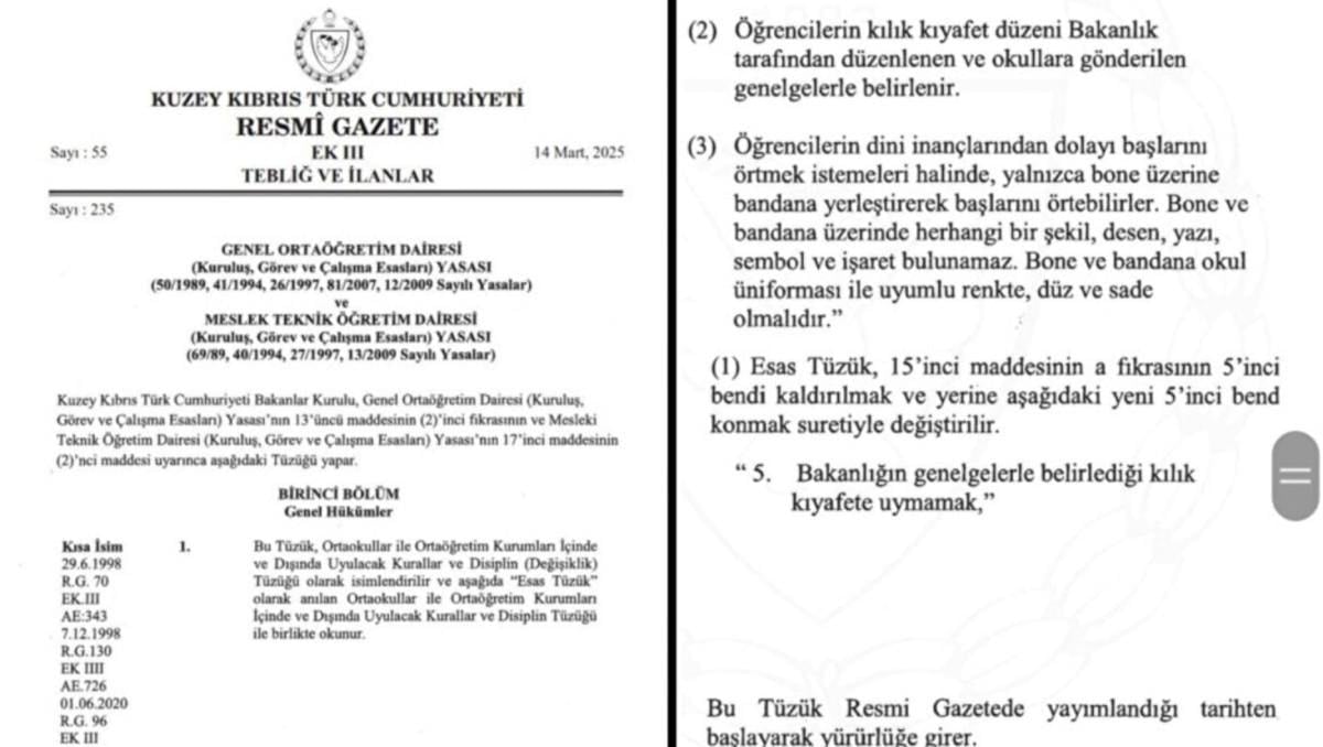 Geçtiğimiz hafta bir öğrencinin başörtüsü ile okula alınmaması üzere KKTC Bakanlar Kurulu, isteyen ortaokul öğrencilerinin "bone" ve "bandana" ile okula gidebilmesine karar verdi.