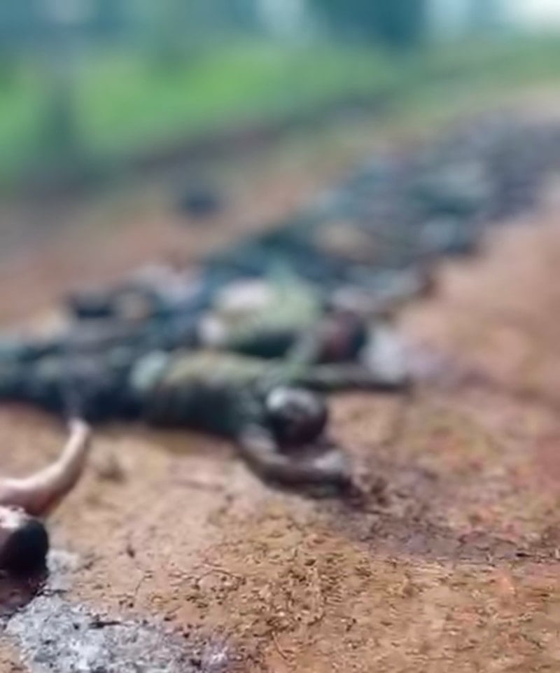 Sosyal medyada paylaşılan videolarda botlu ve kamuflajlı çok sayıda cesedin yola savrulmuş olduğu görülüyor.