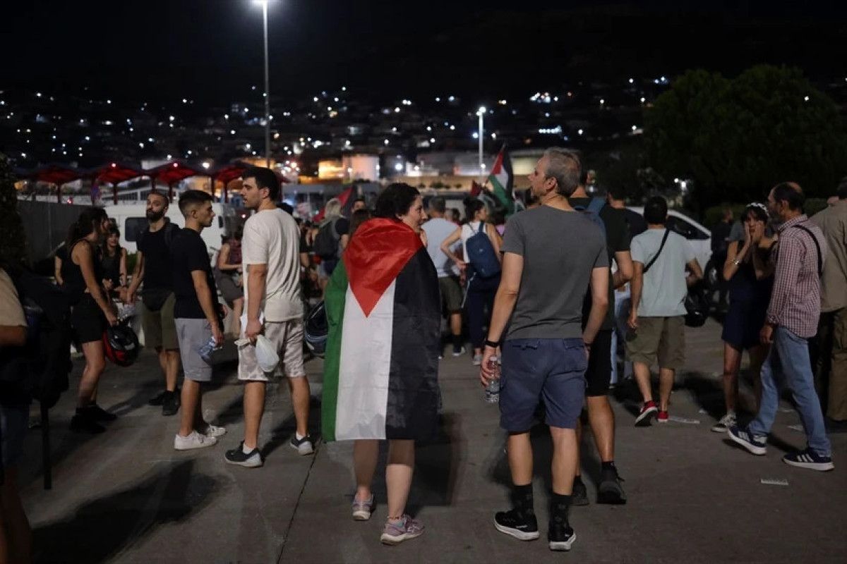 Pire Limanı'nda "Filistin’e özgürlük" sloganı atan eylemciler, askeri amaçla kullanılacak demir çeliğin İsrail'e gönderilmesine karşı çıktı.
