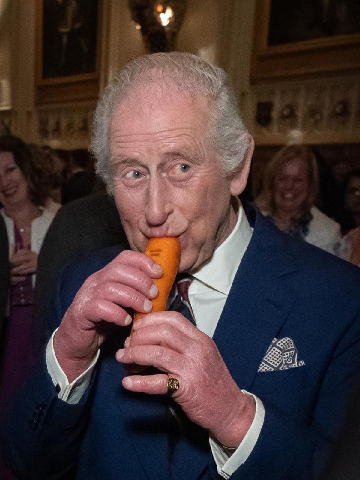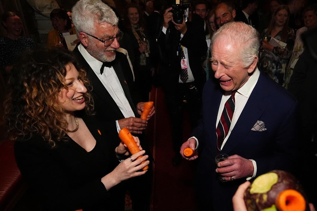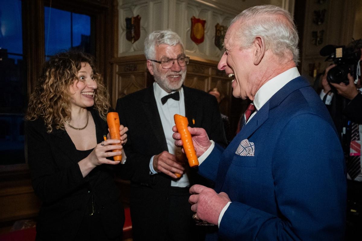 Yaklaşık 350 misafirin önünde havuçla performans sergileyen Kral Charles, "Bu sesi çıkarmanın bu kadar eğlenceli olduğunu bilmiyordum." dedi.
