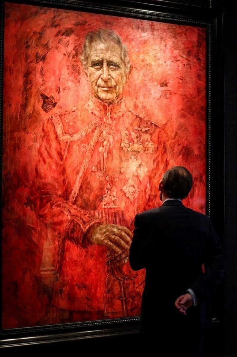 Kırmızı renklerin hakim olduğu portrede Kral Charles, Galler Muhafızları askeri birliğinin üniformasını giymiş ve omzunun hemen üzerinde bir kelebekle tasvir edildi.