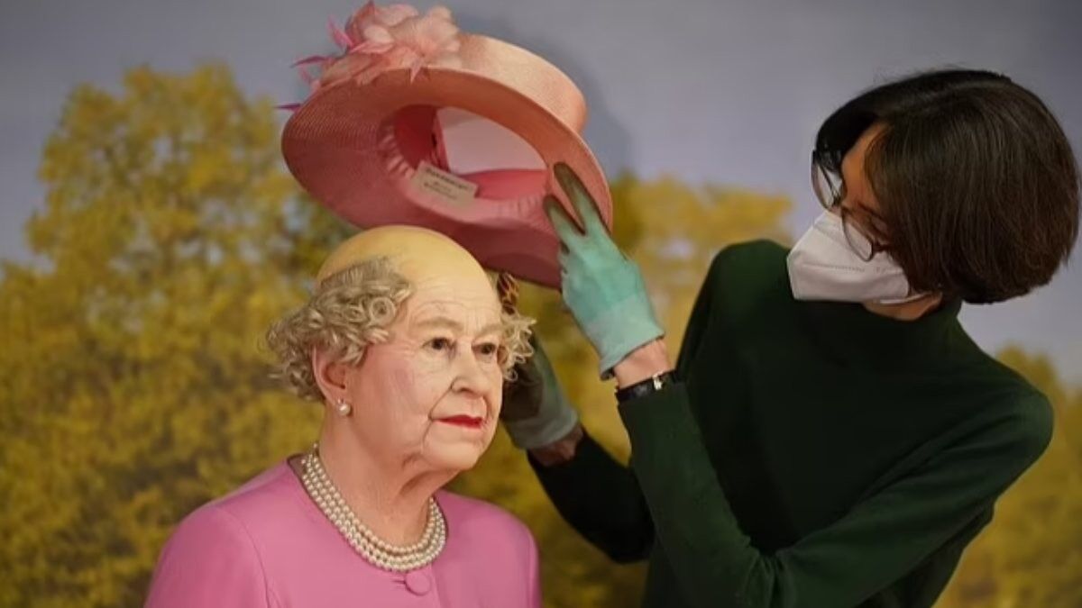 Panoptikum'un Hamburg'daki yönetici ortağı Susanne Faerber, 95 yaşındaki Kraliçe'ye ait heykeldeki şapkayı kaldırdı.