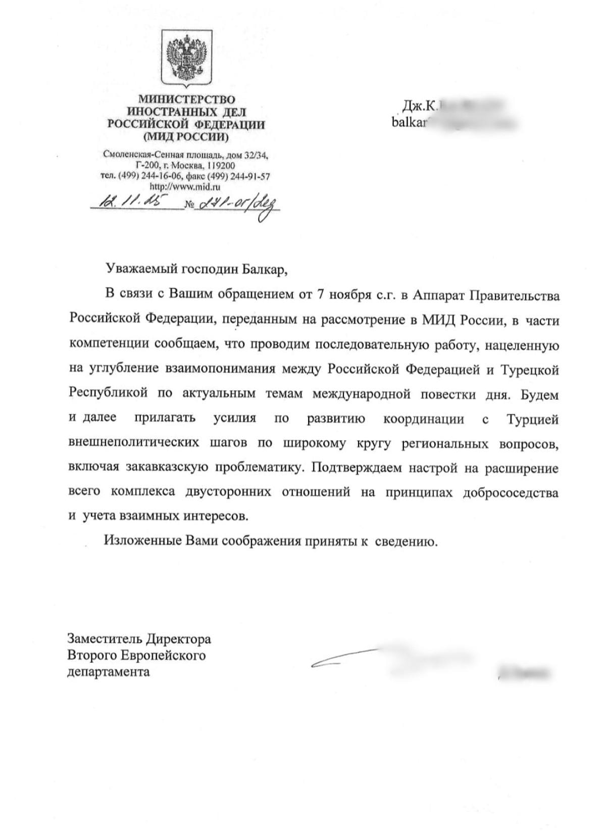 Balkar, Zaharova’nın sözlerinin hem tarihsel olarak yanlış olduğunu hem de Türk-Rus ilişkilerine zarar verebileceğini belirterek Kremlin’e bir yazı gönderdi. Rus makamları ise yazıya kısa sürede dönüş yaptı.