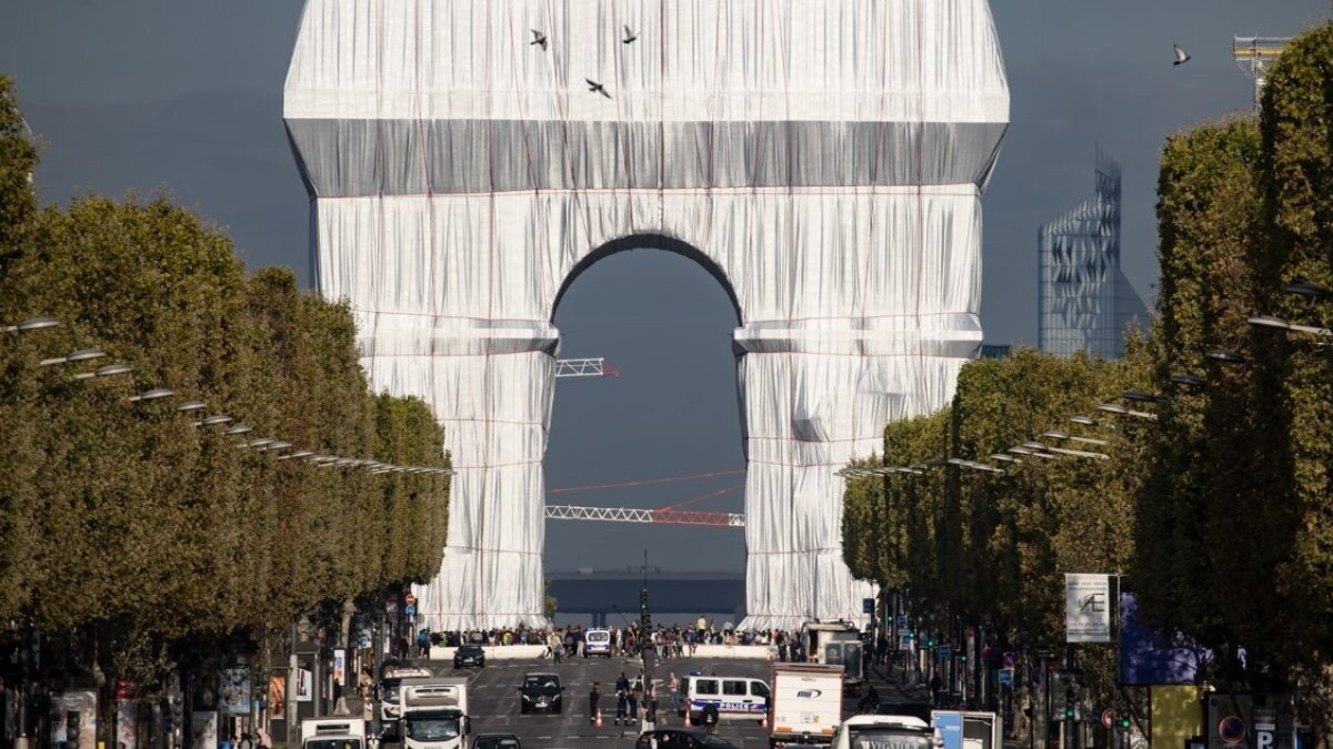 Fransa'nın başkenti Paris’in öne çıkan simgelerinden biri olan Arc de Triomphe (Zafer Takı), 25 bin metrekarelik geri dönüştürülebilir, gümüşe çalan mavi renkli kumaş ile kaplandı.