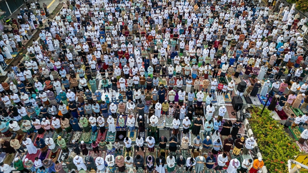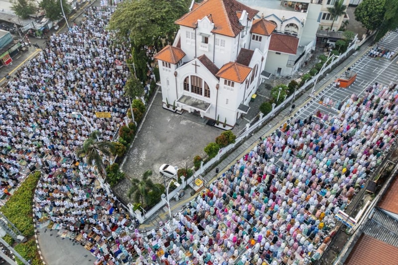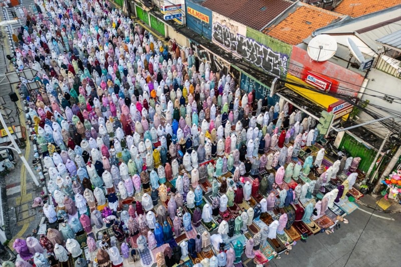 Endonezya'nın başkenti Cakarta da bir araya gelen müslümanlar, caddede bayram namazını kıldı.
