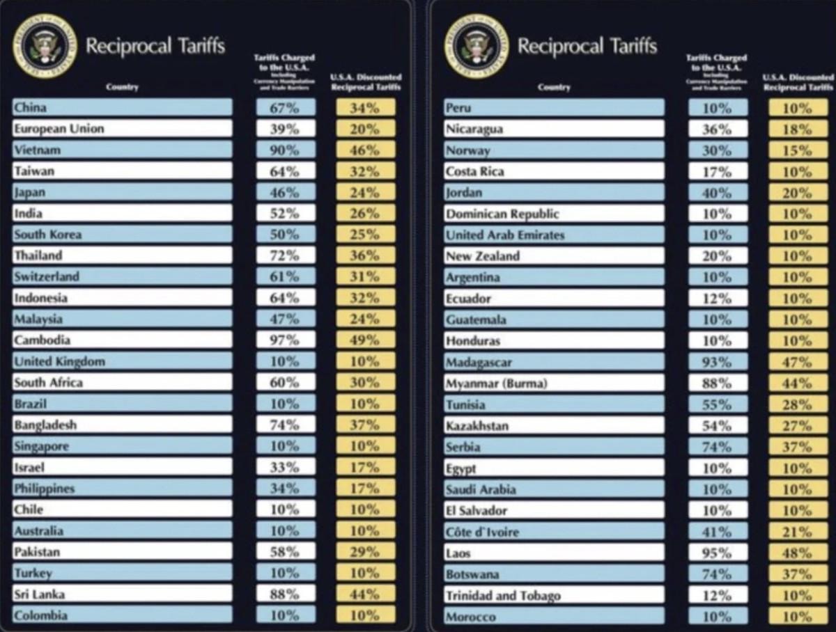 Buna göre; Avrupa Birliği'ne (AB) yüzde 20, Çin'e yüzde 34, Vietnam'a yüzde 46, Tayvan'a yüzde 32, Japonya'ya yüzde 24, Hindistan'a yüzde 26, Güney Kore'ye yüzde 25, Tayland'a yüzde 36, İsviçre'ye yüzde 31, Endonezya'ya yüzde 32, Malezya'ya yüzde 24, Kamboçya'ya yüzde 49, Güney Afrika'ya yüzde 30, Bangladeş'e yüzde 37 ve İsrail'e yüzde 17 tarife getirildi.
