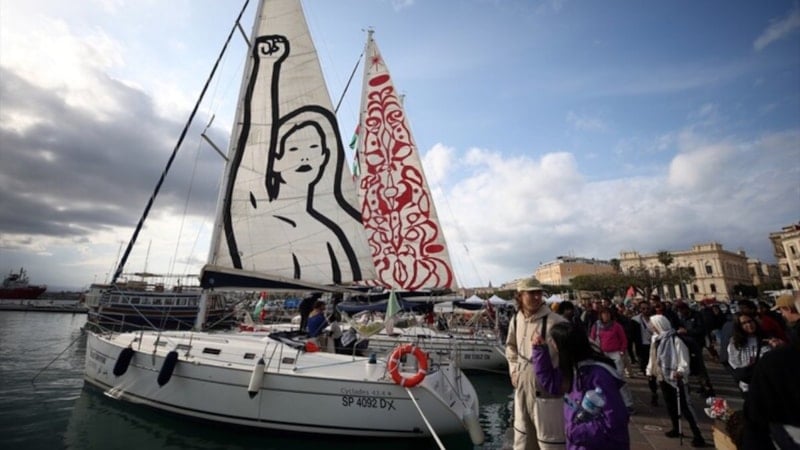 Filistin bayrakları ve sembolleriyle donatılan tekneler, Siracusa Limanı’na girişlerinde destekçiler tarafından karşılandı. Sahilde toplanan kalabalık, “Özgür Filistin” sloganlarıyla filoya destek verdi.