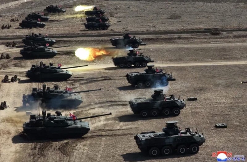 Pyongyang’daki 60 No’lu Eğitim Üssü’nde gerçekleştirilen tatbikatta zırhlı birlikler tanksavar füzeleri ateşlerken arka birlikler, simüle edilen düşman insansız hava araçları ve helikopterleri hedef aldı.