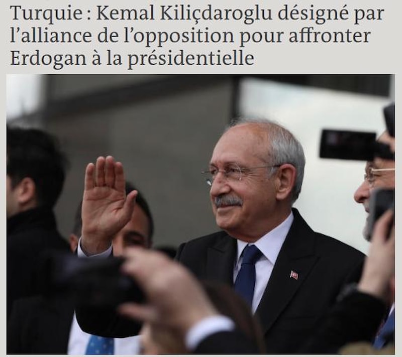 Bu ayrıntıya işaret eden gazetelerden biri olan Fransa basınından Le Monde, "Kemal Kılıçdaroğlu, cumhurbaşkanlığı seçimlerinde Erdoğan'ın karşısına muhalefet ittifakı tarafından tayin edildi." diye yazdı.