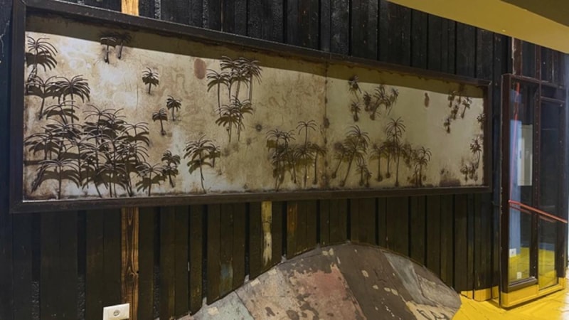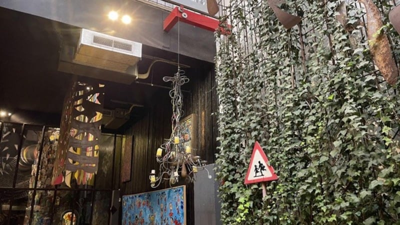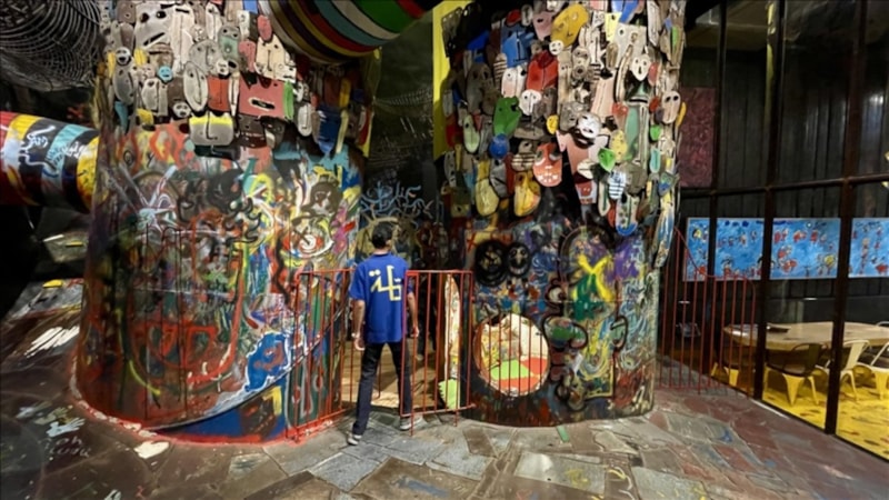 Savaşın izlerini taşıyan kafenin avizeleri, havan toplarından yapılırken; bahçesinde hurda metal ve araç lastiklerinden inşa edilmiş bir çocuk parkı bulunuyor.