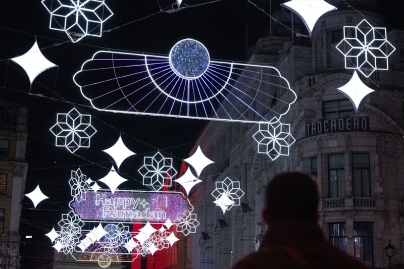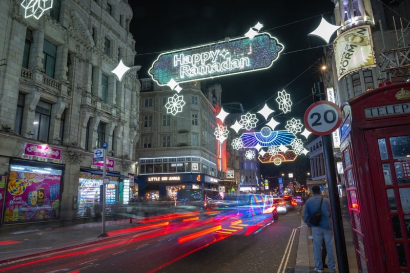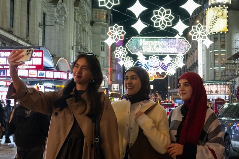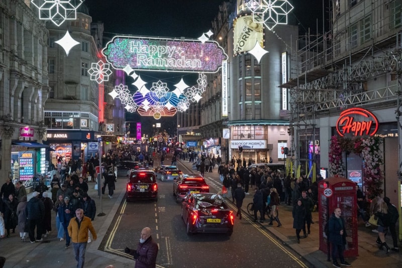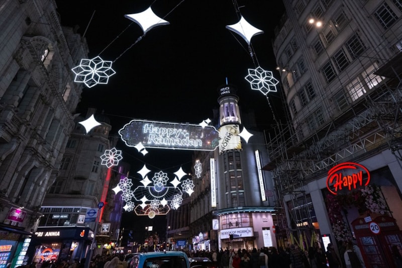 Piccadilly Circus'tan Leicester Square'e uzanan cadde, 30 binden fazla LED ışıkla donatıldı ve "Happy Ramadan" (Mutlu Ramazanlar) yazılarıyla ziyaretçileri karşılıyor.