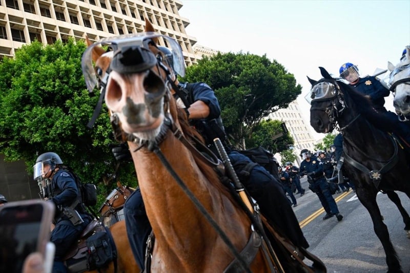 Los Angeles'ta atlı polisler belediye binası önündeki göstericileri dağıtmak için müdahale etti.