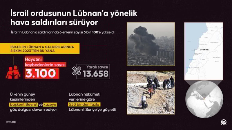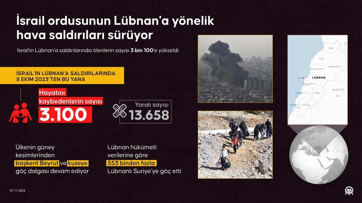 İsrail'in Lübnan'da dün düzenlediği saldırılarda 37 kişinin öldüğü, 105 kişinin yaralandığı vurgulanan açıklamada, İsrail ordusunun ülkeye yönelik devam eden saldırıları sonucu yaşamını yitirenlerin sayısının 3 bin 100'e yükseldiği ifade edildi.