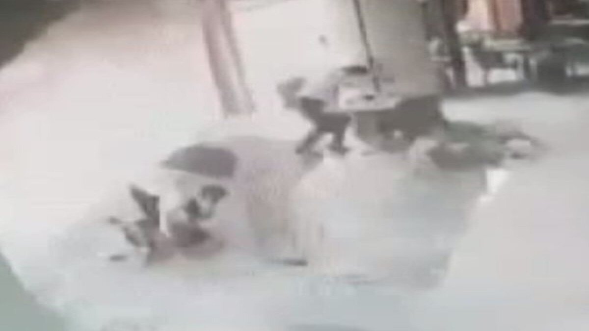 Görüntülerde patlamanın şiddetiyle kopan moloz ve cam parçalarının alışveriş merkezi önündeki insanlara çarptığı görülüyor.
