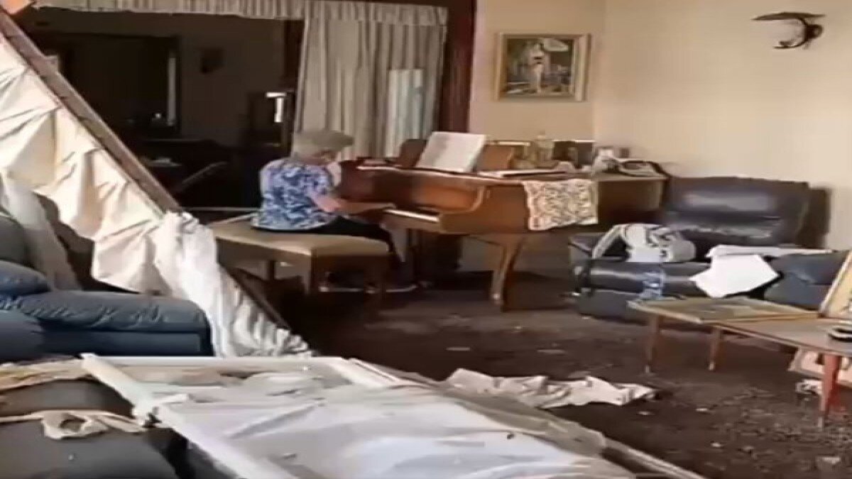 Kadın, moloz yığınları arasında piyano çalarken, evindeki yıkımın boyutu da gözler önüne serildi.