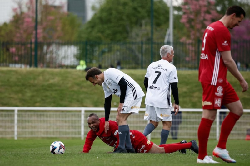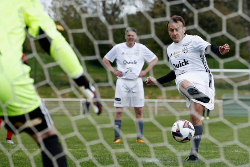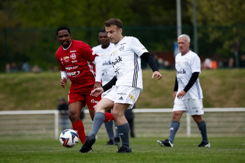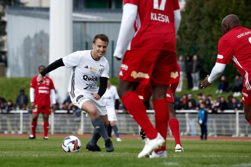 Futbol tutkunu Macron, Yvelines'teki bir kulüpte futbol efsaneleri ve ünlü oyuncularla bir yardım maçında forma giydi.