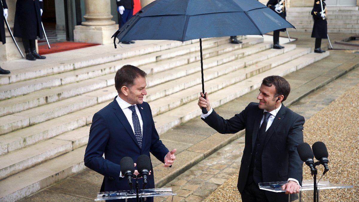 Bu sırada görevlilerin getirdiği şemsiyeyi alan Macron, şemsiyeyi Slovak Başbakan Matoviç'e doğru tuttu.