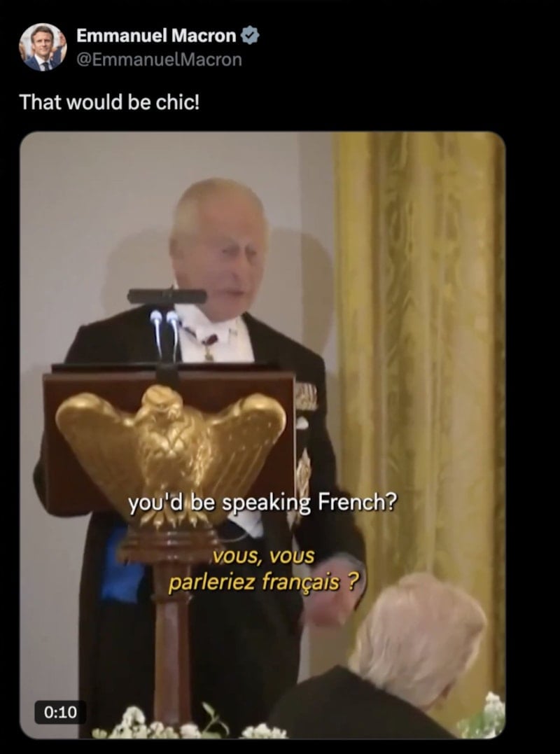 ABD Kongresi'ne hitabında Donald Trump'a göndermede bulunan İngiltere Kralı III. Charles, "Biz olmasaydık, siz Fransızca konuşuyor olacaktınız" derken o anları paylaşan Macron, 'Çok şık olurdu' notunu düştü.